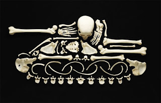 Some powerful art message this is- using human bones shaped as guns and bombs. The series is called "Stop the Violence" and is by Francois Robert. More pictures here.